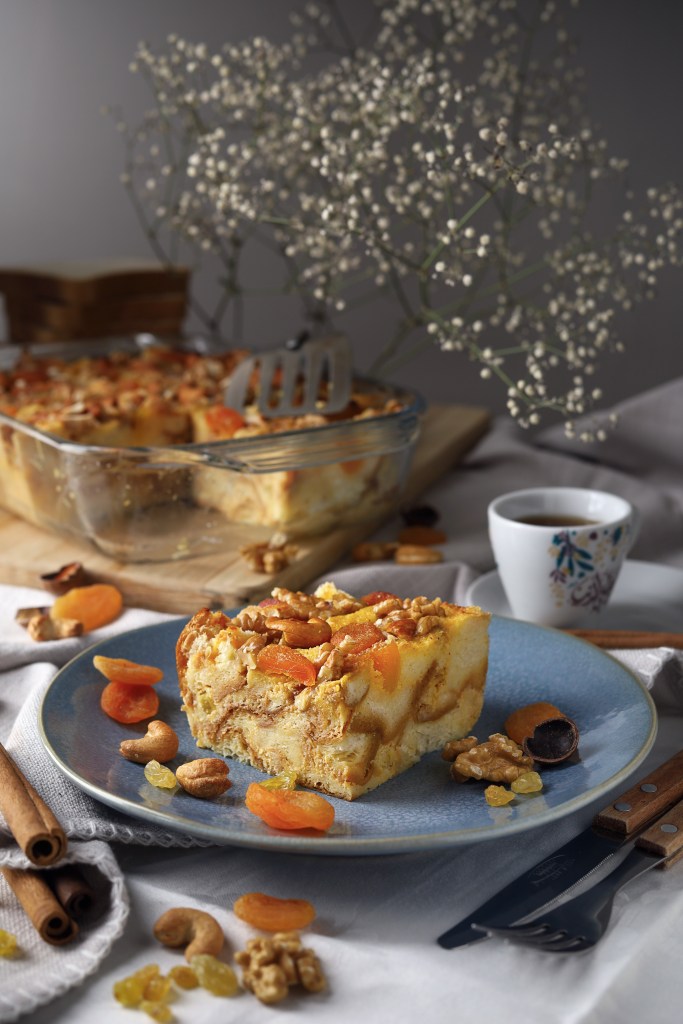 - Carefully pour the whole mixture onto the bread in the baking dish. Make sure that the bread is fairly submerged in the liquid and garnish with some extra dried fruit and nuts.